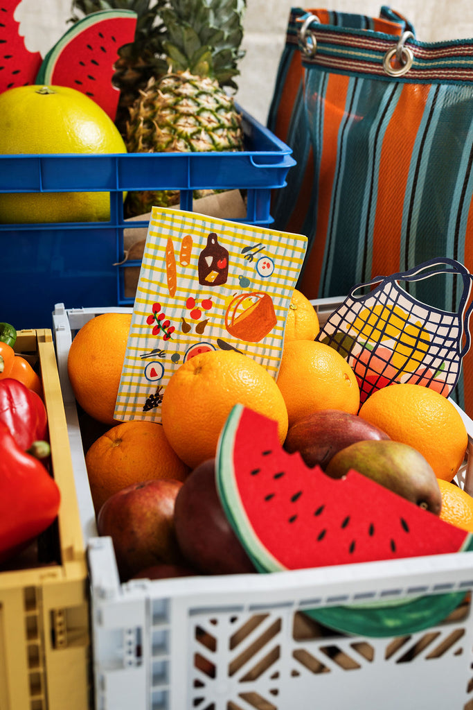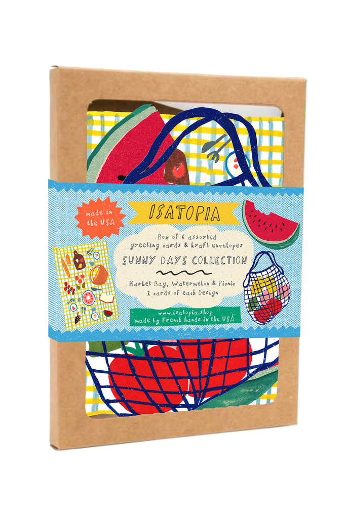 The Sunny Days box set, is a bright trio of everyday cards inspired by sunny moments: a market bag, a watermelon, and a picnic. Perfect to celebrate the warmer days or to send out some sunshine!